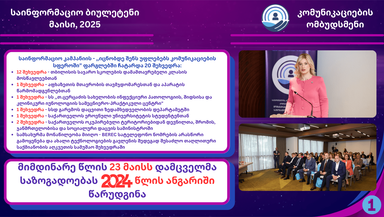 მიმდინარე წლის 3 ივნისს, კომუნიკაციების ომბუდსმენი – გვანცა ჩხეიძე საქართველოს სახალხო დამცველის აპარატის თანამშრომლებს შეხვდა. შეხვედრის მონაწილეები გაეცნენ სამსახურის საქმიანობას და მიიღეს ინფორმაცია, სატელეკომუნიკაციო სფეროში, მომხმარებელთა ინტერესების დაცვის მიზნით მოქმედი საკანონმდებლო გარანტიების, კომპანიების ვალდებულებების, საჩივრის/განცხადების განხილვის წესების და ვადების, აგრეთვე, დარგში შემავალი სხვა საკითხების შესახებ. შეხვედრის ფარგლებში განხილული იქნა მომხმარებელთა