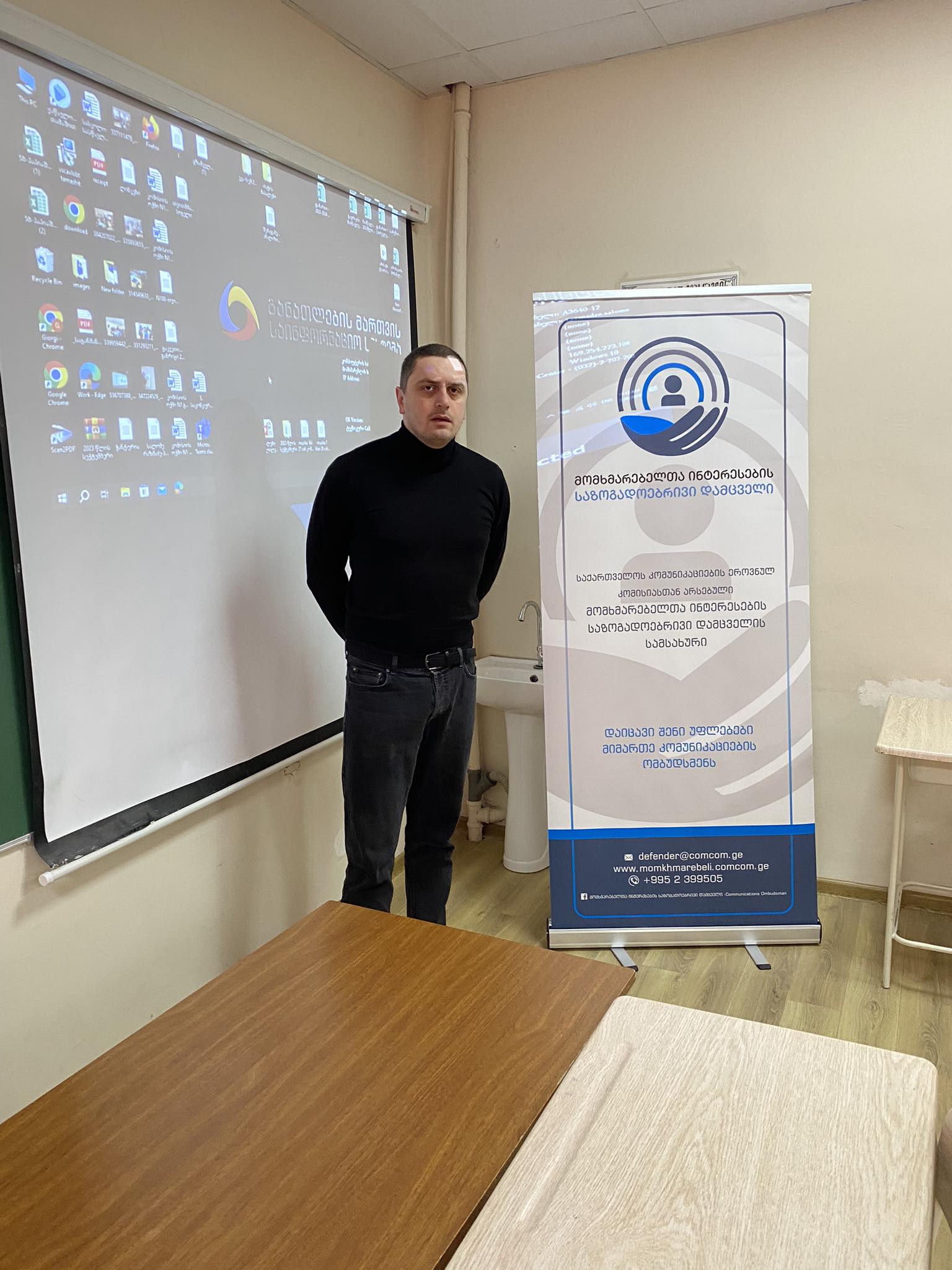 “იცნობდე შენ უფლებებს კომუნიკაციების სფეროში” აქტივობის ფარგლებში, მომხმარებელთა ინტერესების საზოგდაოებრივი დამცველის სამსახურმა, მიმდინარე წლის 26 თებერვალს კიდევ ერთი შეხვედრა გამართა, ქ. თბილისის 103-ე საჯარო სკოლაში. ბელა დეველაშვილმა, სკოლის უფროსკლასელებს და პედაგოგ-მასწავლებლებს, წარუდგინა ინფორმაცია სამსახურის საქმიანობის შესახებ. გააცნო კანონმდებლობით მინიჭებული უფლებები, კომპანიების ვალდებულებები, საჩივრის/განცხადების განხილვის წესები და ვადები, აგრეთვე დარგში შემავალი
