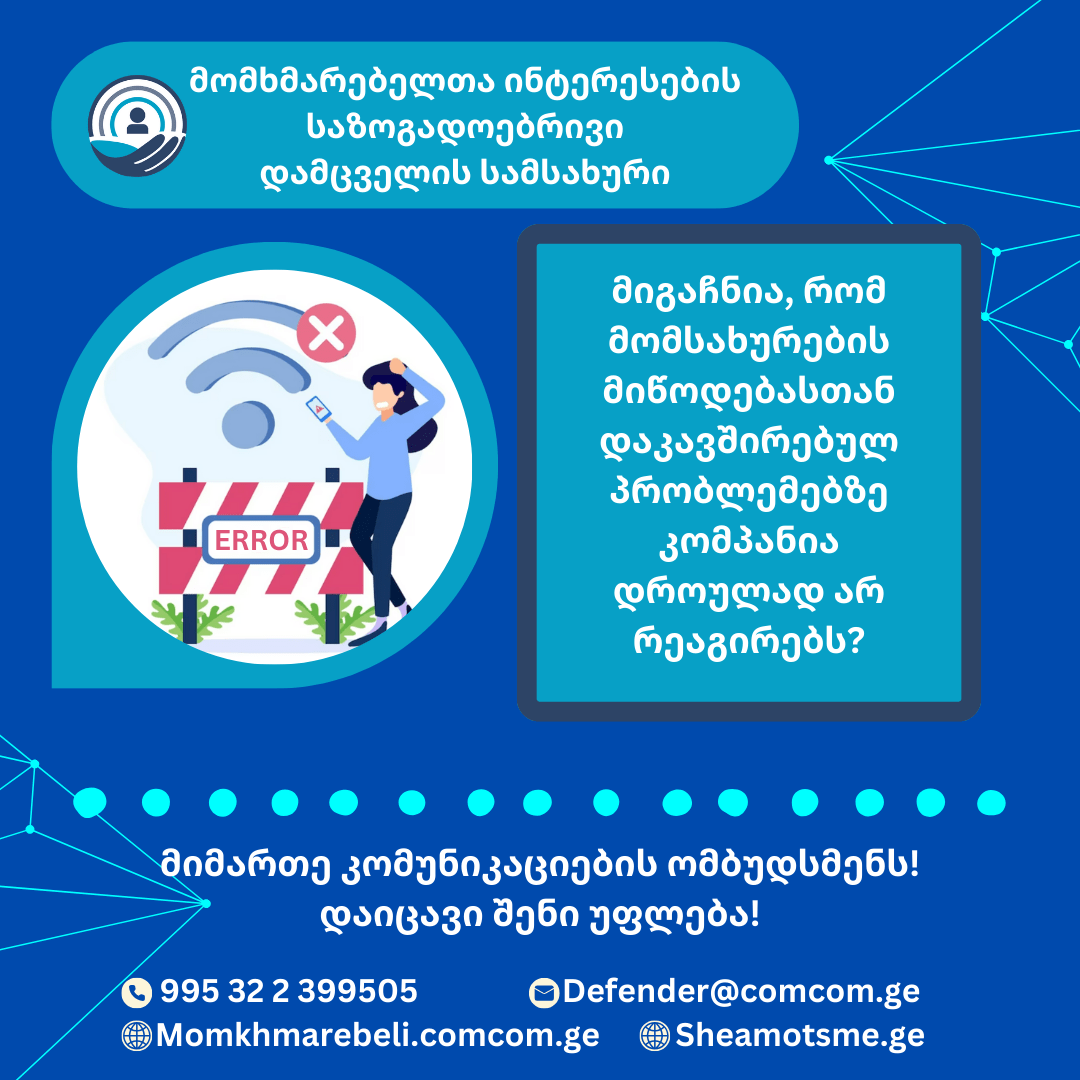 მიმდინარე წლის 7 თებერვალს, ქ. თელავში, მომხმრებელთა ინტერესების საზოგადოებრივი დამცველის სამსახურის წარმომადგენელმა, შოთა შაფაქიძემ, მონაწილეობა მიიღო Small and Medium Telecom Operators Association of Georgia-ის მიერ გამართულ სამუშაო შეხვედრაში, რომელიც საქართველოში ინტერნეტის ფასის დაწევის, ასევე, ფიქსირებული ინტერნეტის ბაზრის გახსნისა და ხარისხის გაუმჯობესების საკითხების განხილვას დაეთმო. შოთა შაფაქიძემ ოპერატორებს მომხმარებლებისგან შემოსული საჩივრების