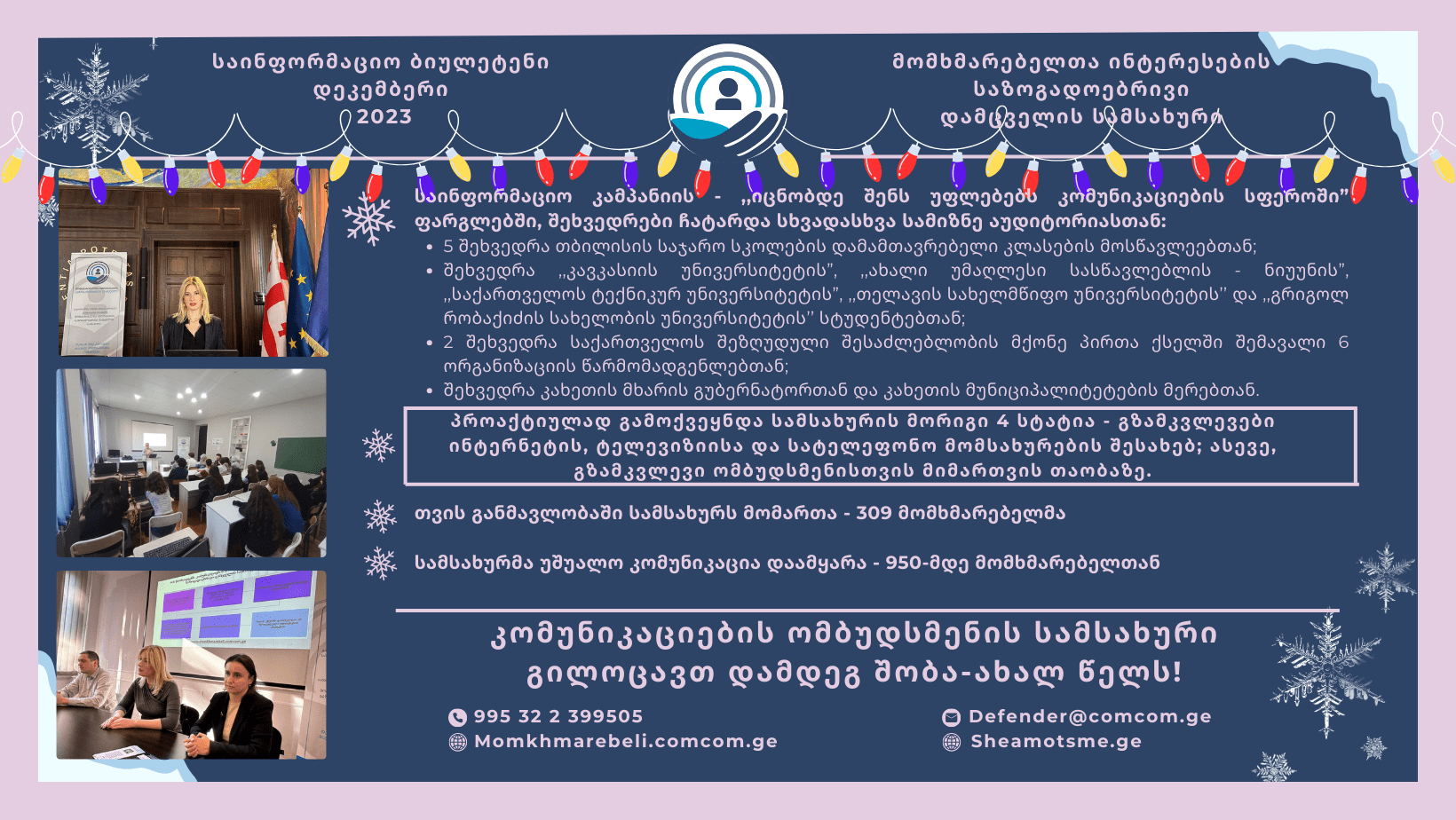 მიმდინარე წლის 21 დეკემბერს, კომუნიკაციების ომბუდსმენის და ენერგოომბუდსმენის სამსახურებმა, ერთობლივი შეხვედრა გამართეს იაკობ გოგებაშვილის სახელობის თელავის სახელმწოფო უნივერსიტეტში. საინფორმაციო შეხვედრას ესწრებოდნენ უნივერსიტეტის რექტორი,- შალვა ჭკადუა, უნივერსიტეტის პროფესორ/მასწავლებლები და უნივერისტეტის სტუდენტები. შეხვედრა მიზნად ისახავდა კომუნიკაციების და ენერგო მომსახურების სფეროს მომხმარებელთათვის მინიჭებული უფლებების გაცნობას . გვანცა ჩხეიძემ შეხვედრის მონაწილეებს წარუდგინა ინფორმაცია სამსახურის