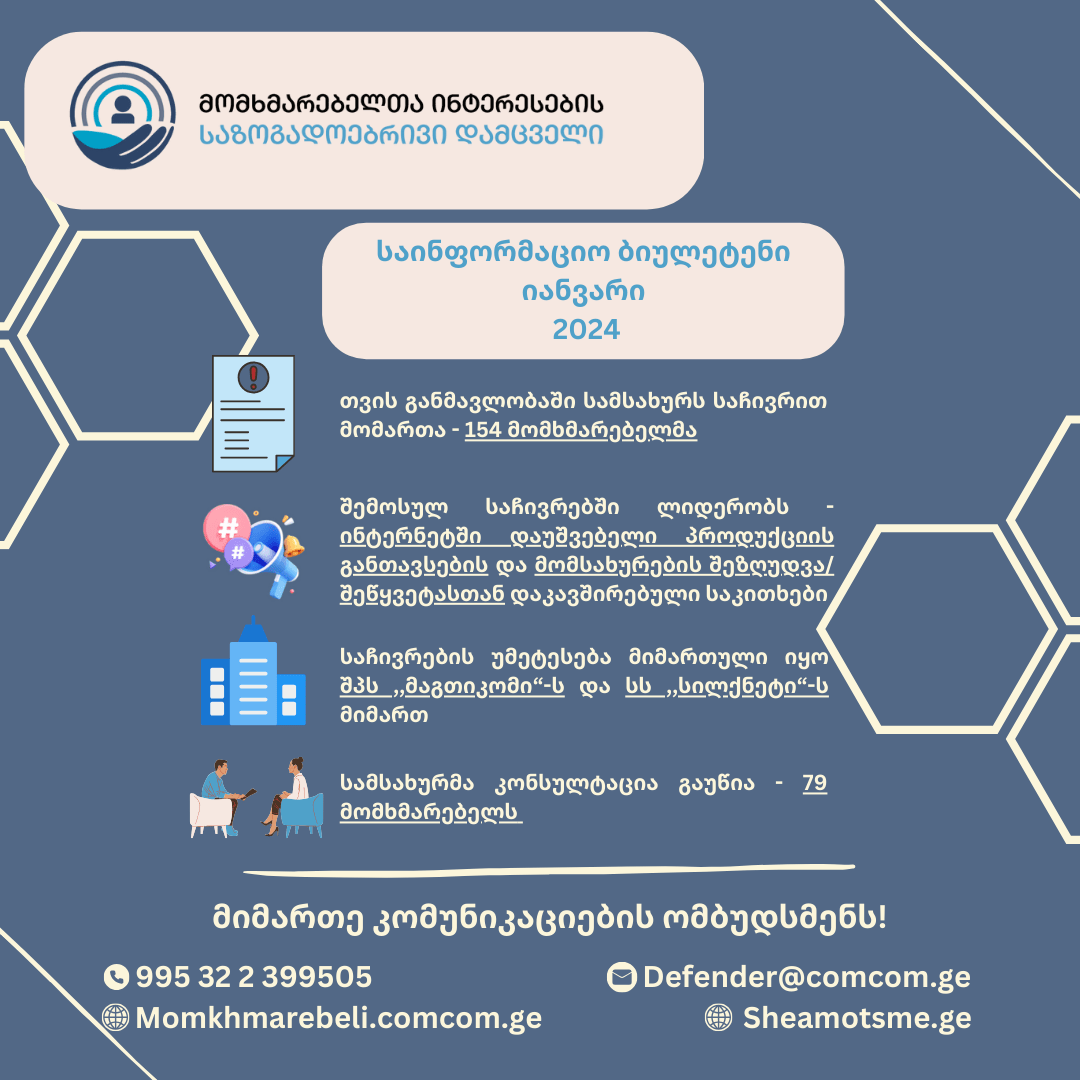 მომხმარებელთა ინტერესების საზოგადოებრივი დამცველის სამსახურმა 2023 წლის ნოემბერში ჩაატარა კვლევა მომსახურების ხარისხის გაუმჯობესების მიზნით. კვლევის სამიზნე ჯგუფს წარმოადგენდა ის მომხმარებლები, რომლებმაც დამცველის სამსახურის სერვისით მიმდინარე წლის დასაწყისიდან ოქტომბრამდე პერიოდში ისარგებლეს. კვლევის ფარგლებში, შემთხვევითობის პრინციპით, გამოიკითხა სამსახურში შემოსული წერილობითი საჩივრის ყოველი მეოთხე ავტორი. აღნიშნული გამოკითხვის შედეგები სამსახურს დაეხმარება მომხმარებლებისთვის მომავალი