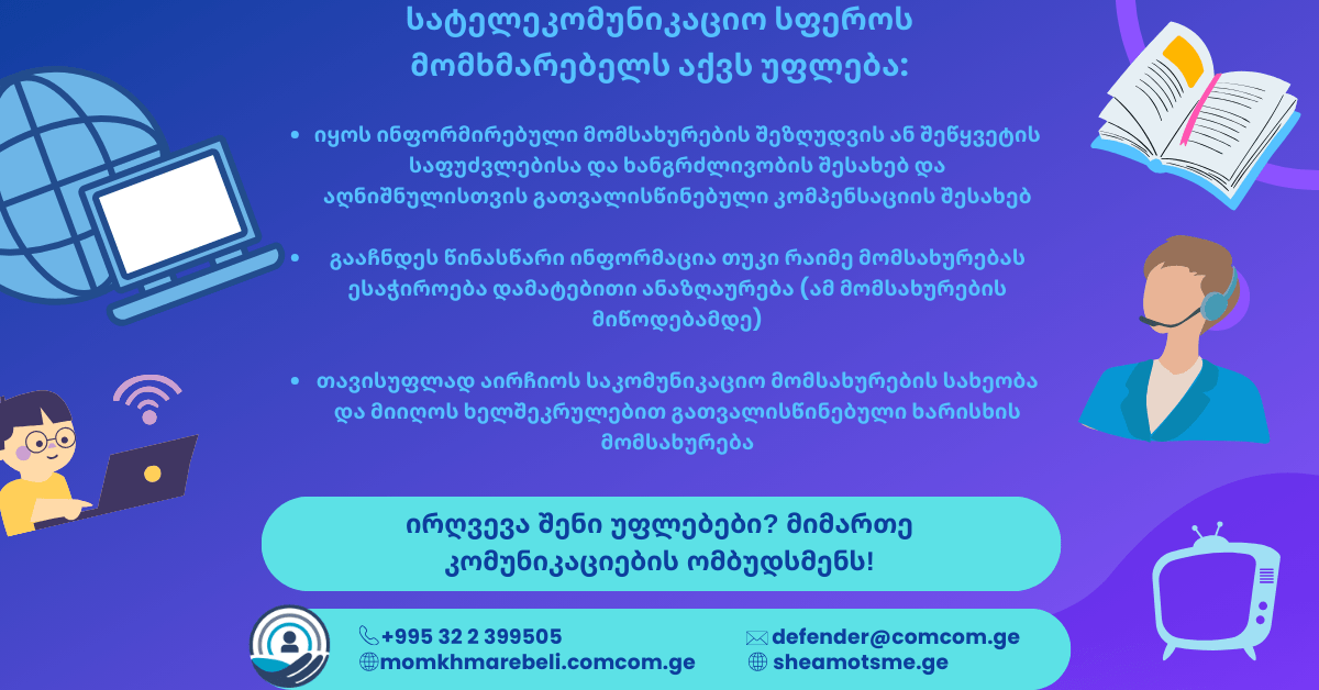 მიმდინარე წლის 18 სექტემბერს, კომუნიკაციების ომბუდსმენის სამსახურმა შეხვედრა გამართა ფოთის მუნიციპალიტეტის საბიბლიოთეკო გაერთიანების წარმომადგენლებთან. კომუნიკაციების ომბუდსმენმა გვანცა ჩხეიძემ შეხვედრის მონაწილეებს წარუდგინა ინფორმაცია სამსახურის საქმიანობის შესახებ. მომხმარებლებს გააცნო კანონმდებლობით მინიჭებული უფლებები, კომპანიების ვალდებულებები, საჩივრის/განცხადების განხილვის წესები და ვადები, აგრეთვე დარგში შემავალი სხვა საკითხები.