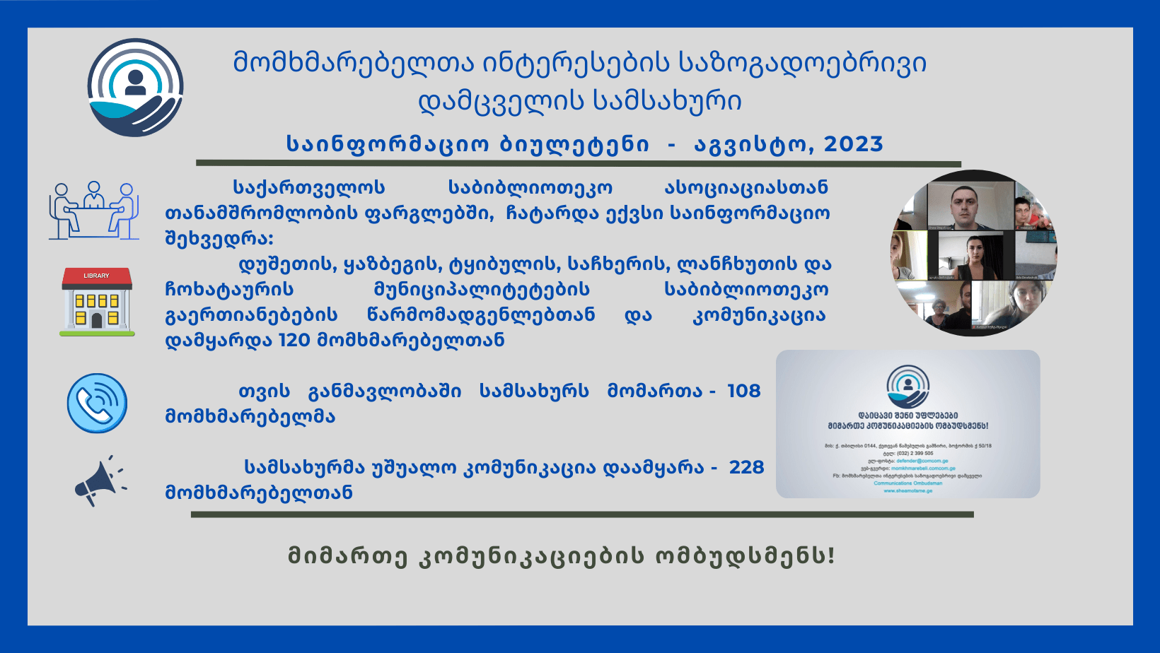 საქართველოს საბიბლიოთეკო ასოციაციასთან თანამშრომლობის ფარგლებში, ჩატარდა ექვსი საინფორმაციო შეხვედრა: დუშეთის, ყაზბეგის, ტყიბულის, საჩხერის, ლანჩხუთის და ჩოხატაურის მუნიციპალიტეტების საბიბლიოთეკო გაერთიანებების წარმომადგენლებთან და კომუნიკაცია დამყარდა 120 მომხმარებელთან თვის განმავლობაში სამსახურს მომართა – 108 მომხმარებელმა სამსახურმა უშუალო კომუნიკაცია დაამყარა – 228 მომხმარებელთან