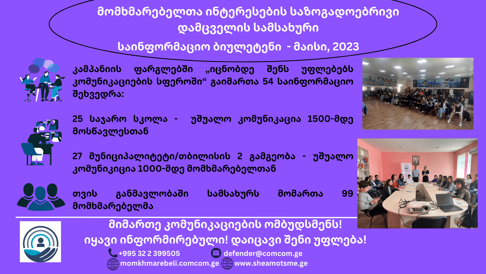 მიმდინარე წლის 14 ივნისს, გვანცა ჩხეიძემ, სასტუმრო “რუმსი – თბილისში“, მომხმარებელთა ინტერესების საზოგადოებრივი დამცველის სამსახურის 2022 წლის საქმიანობის ანგარიში წარადგინა. საზოგადოებრივმა დამცველმა შეაჯამა 2022 წელს მომხმარებელთა უფლებებისა და კანონიერი ინტერესების დაცვის მიზნით განხორციელებული ღონისძიებები: 2022 წლის საქმიანობის ანგარიში; მომხმარებელთა საჩივრების სტატისტიკა და რეაგირების შედეგები; სატელეკომუნიკაციო ბაზარზე არსებული გამოწვევები; 2023 წელს