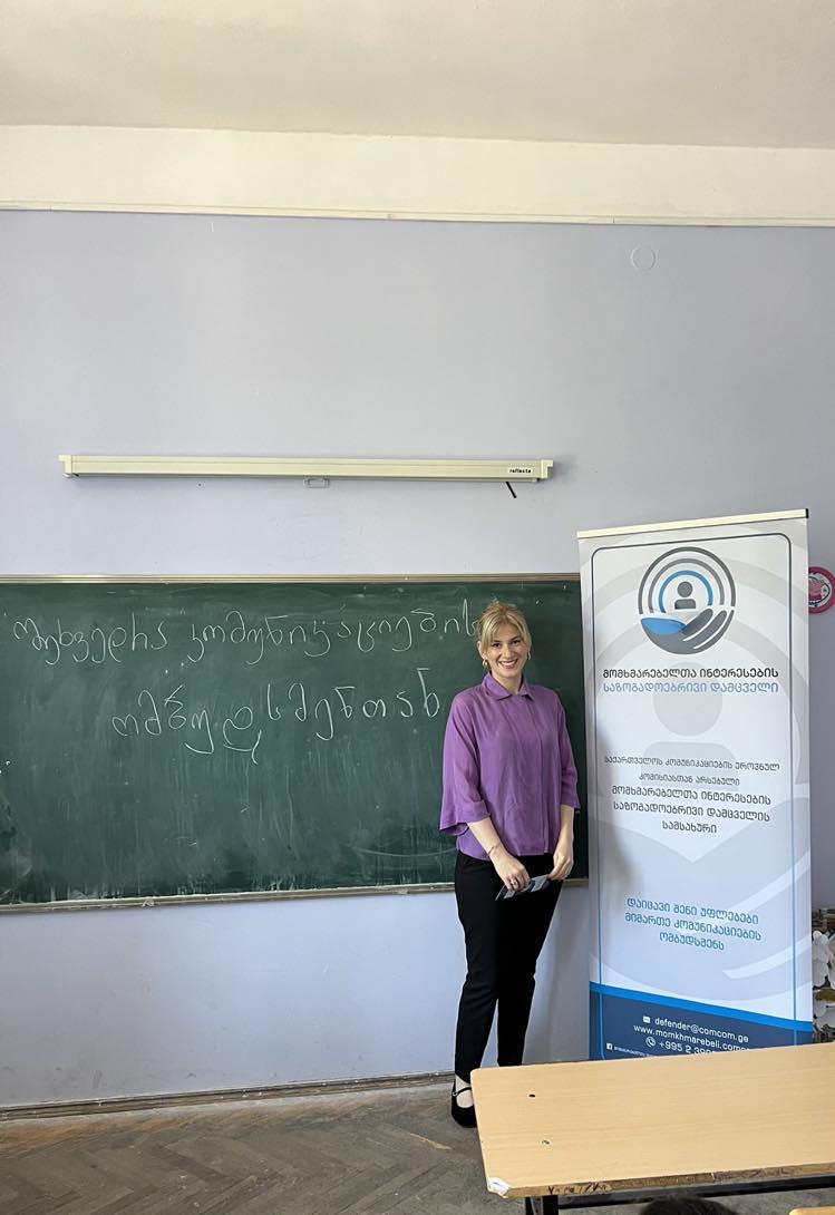 იცნობდე შენს უფლებებს კომუნიკაციების სფეროში” აქტივობის ფარგლებში, მომხმარებელთა ინტერესების საზოგადოებრივი დამცველი, მიმდინარე წლის 30 მაისს თბილისის 46-ე საჯარო სკოლას ეწვია. გვანცა ჩხეიძემ შეხვედრის მონაწილეებს წარუდგინა ინფორმაცია სამსახურის საქმიანობის შესახებ. მოსწავლეებს და პედაგოგებს გააცნო კანონმდებლობით მინიჭებული უფლებები, კომპანიების ვალდებულებები, საჩივრის/განცხადების განხილვის წესები და ვადები, აგრეთვე დარგში შემავალი სხვა საკითხები.