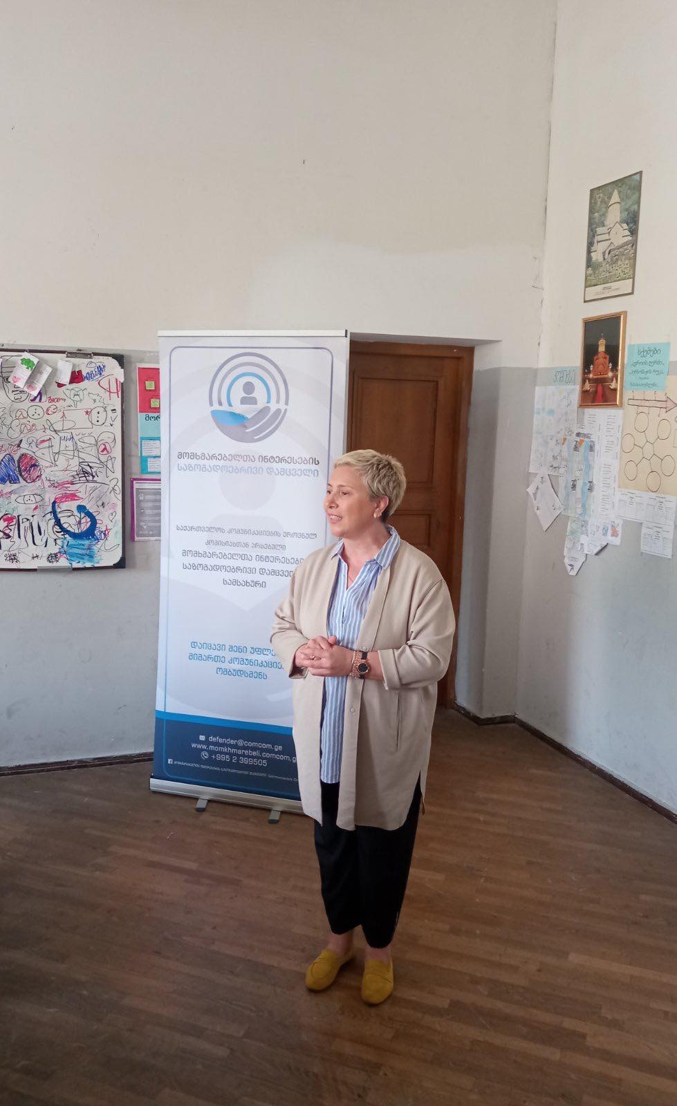მომხმარებელთა ინტერესების საზოგადოებრივი დამცველის სამსახური განაგრძობს საინფორმაციო შეხვედრებს საჯარო სკოლების მოსწავლეებთან და პედაგოგებთან. მიმდინარე წლის 23 მაისს შეხვედრა გაიმართა თბილისის კლასიკური გიმნაზიის მოსწავლეებთან და პედაგოგებთან. სოფო ჯაფარიძემ შეხვედრის მონაწილეებს წარუდგინა ინფორმაცია სამსახურის საქმიანობის შესახებ. მომხმარებლებს გააცნო კანონმდებლობით მინიჭებული უფლებები, კომპანიების ვალდებულებები, საჩივრის/განცხადების განხილვის წესები და ვადები, აგრეთვე დარგში შემავალი სხვა