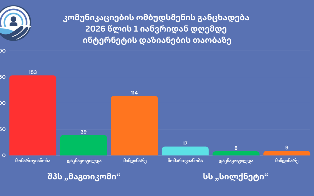 კომუნიკაციების ომბუდსმენის სამსახურში 2026 წლის დასაწყისიდან დღემდე გაზრდილია მომართვიანობა, მთელი ქვეყნის მასშტაბით ინტერნეტის დაზიანების საკითხთან მიმართებაში.